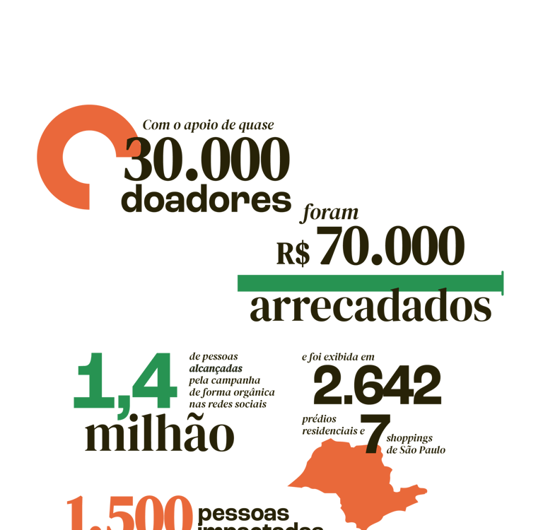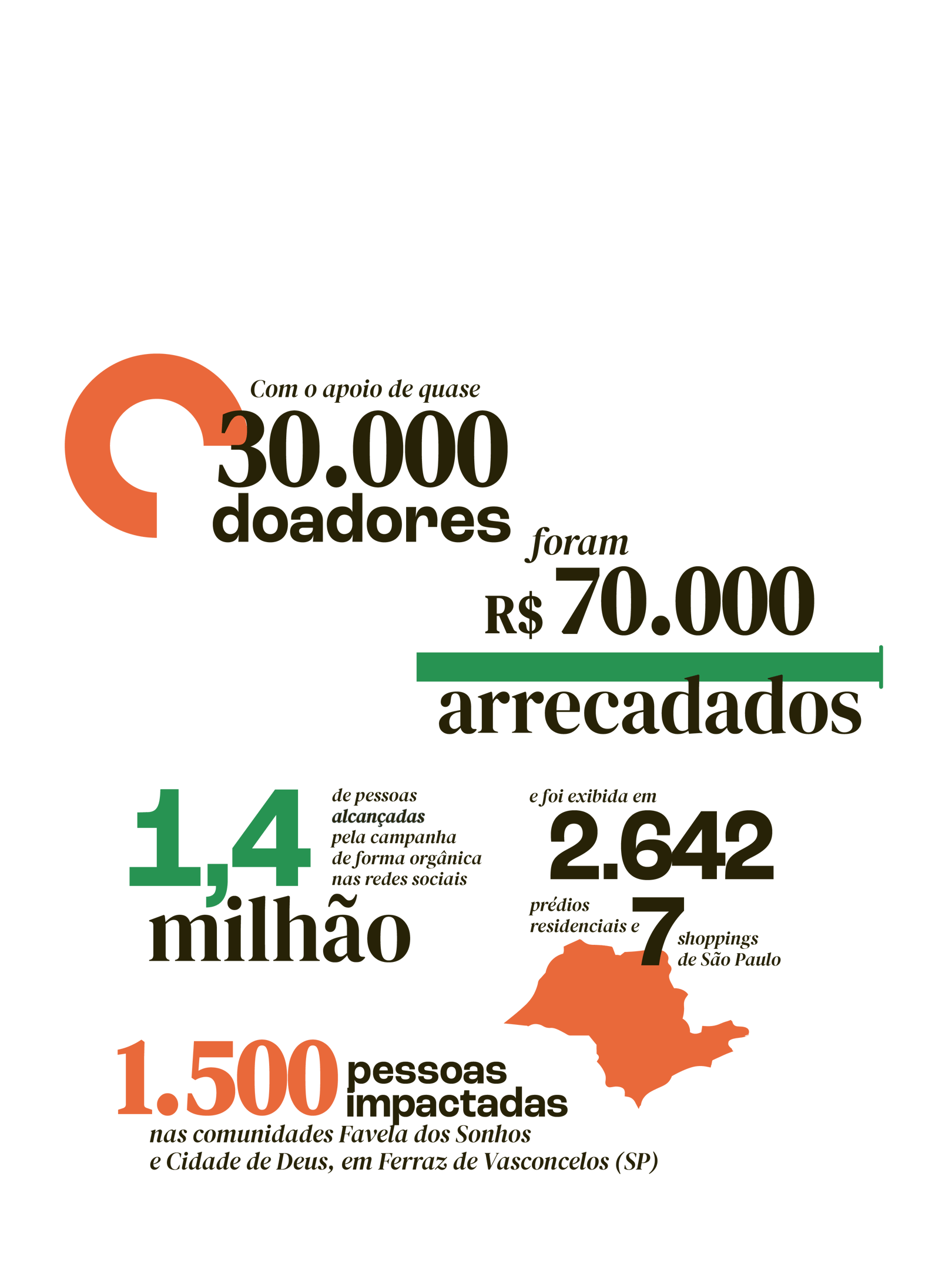 Foram mais de R$70 mil arrecadados pelo Vakinha para viabilizar a compra de cestas natalinas contendo itens indispensáveis para a ceia de natal. Com apoio da Helloo, empresa de mídia OOH, convidados milhares de doadores a fazer diferença, exibindo as formas de apoiar a campanha em telas de edifícios residenciais e shoppings de São Paulo.